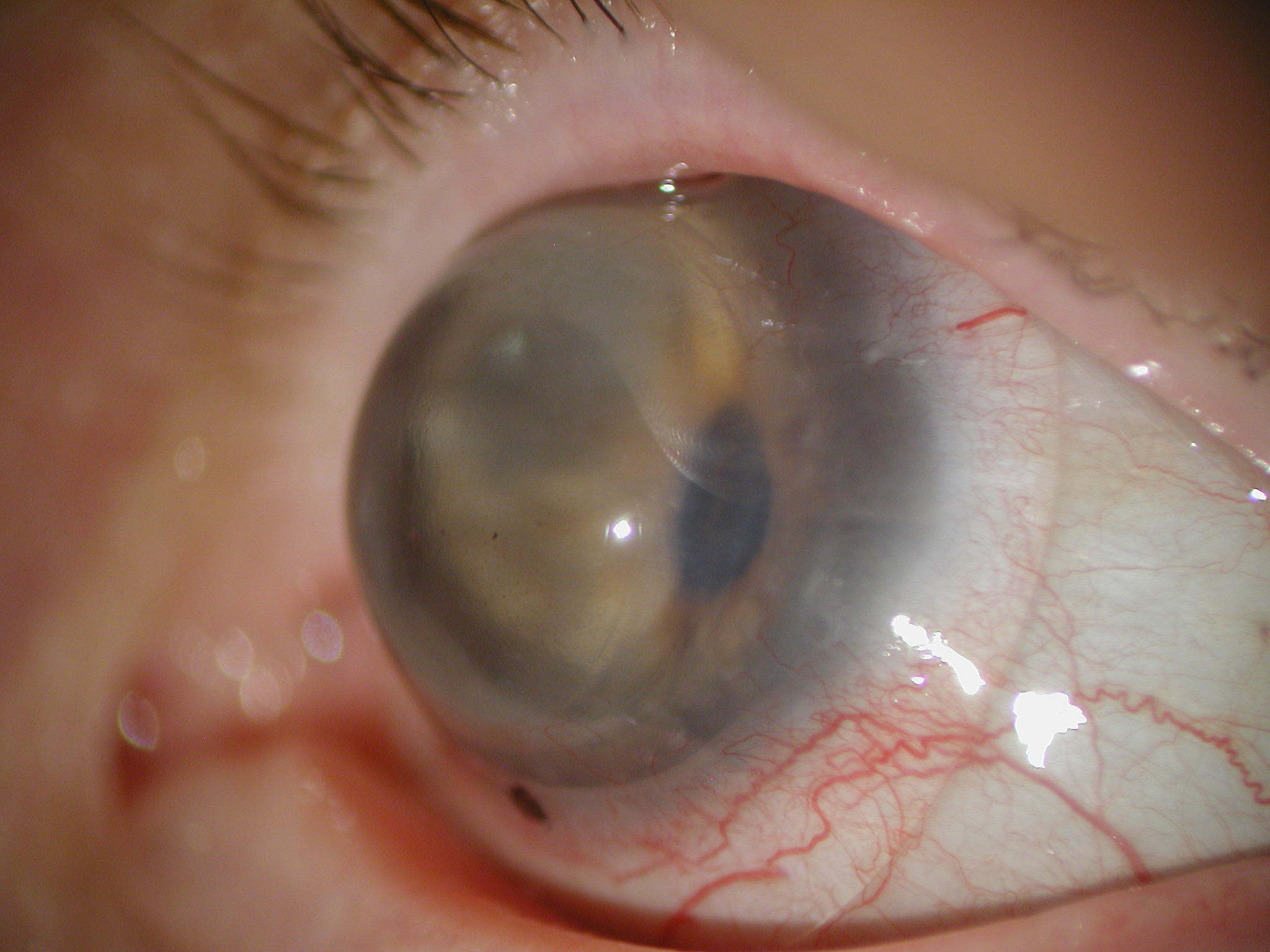 74 yo female with history of keratoconus and previous penetrating keratoplasty performed 27 years ago. The graft was clear with gross astigmatism due to extreme host ectasia. The scleral lens provided good correction to 6/12.