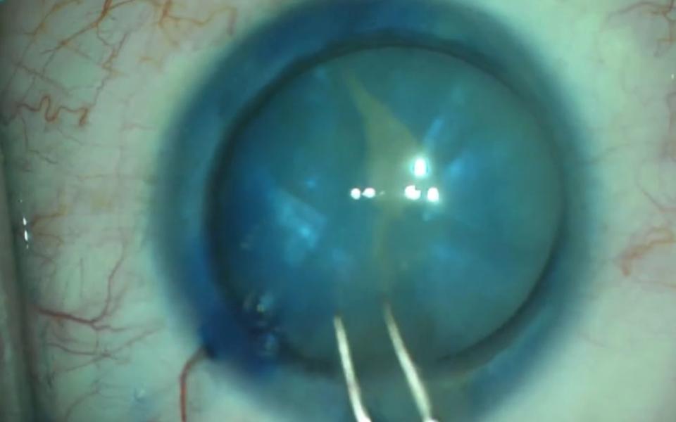 The Argentinan Flag sign more commonly occurs in patients with mature nuclear sclerosis. The anterior capsule is stained with trypan blue (Vison Blue). When the capsule is decompressed with a 25G
