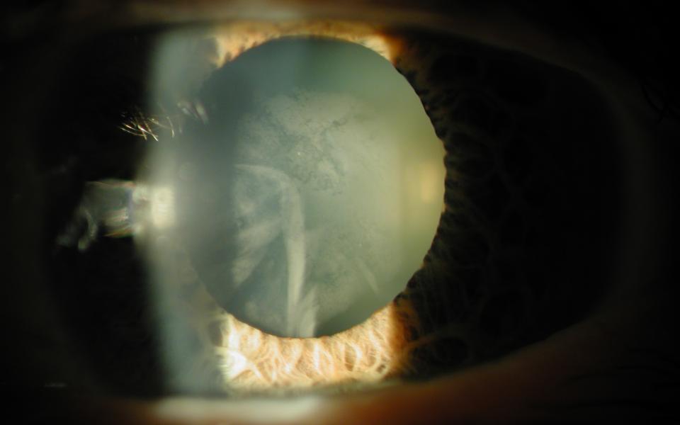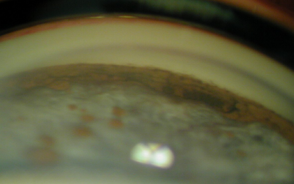 78 Male presenting with blurring of vision for 4 months. Slit lamp examination demonstrated corneal OSSN, with characteristic fimbriated margin. He was commenced on topical interferon alpha-2b 1
