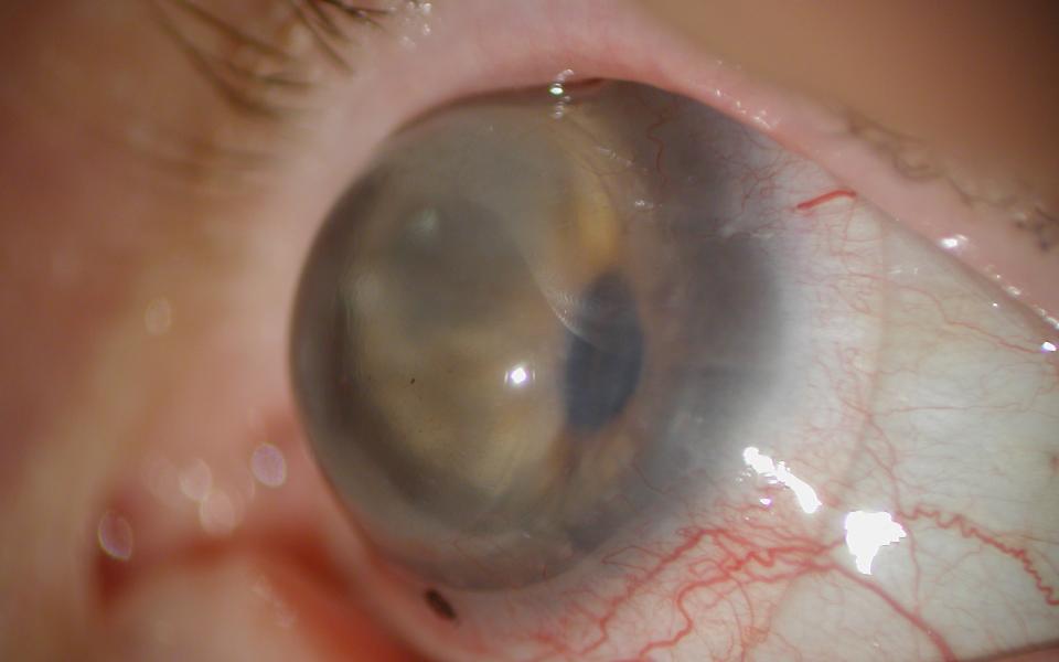 74 yo female with history of keratoconus and previous penetrating keratoplasty performed 27 years ago. The graft was clear with gross astigmatism due to extreme host ectasia. The scleral lens