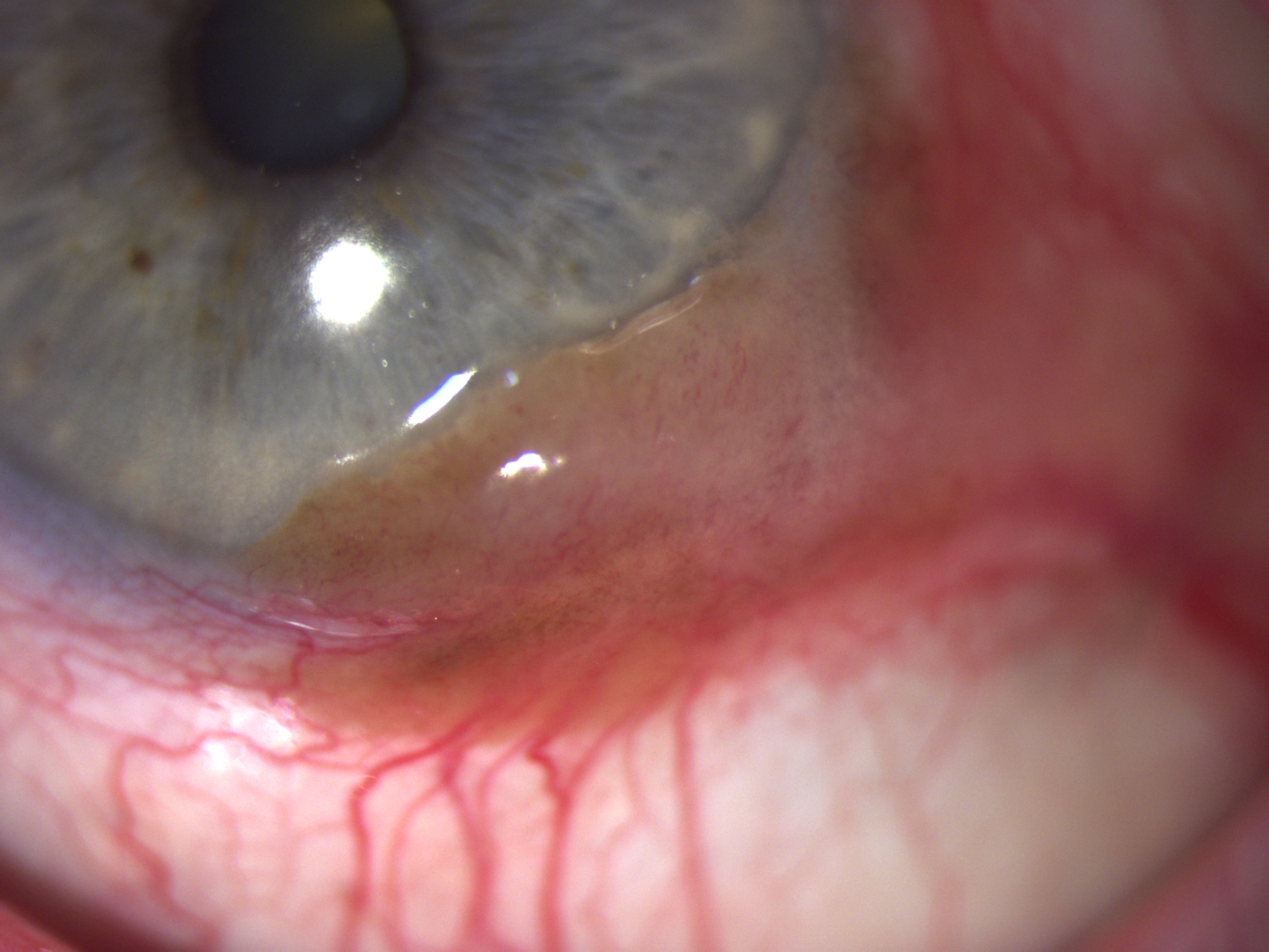 This 85 caucasian female presented with a large left temporal limbal lesion measuring 9 x 3 mm. There was mild pigmentation to large feeder vessels and adjacent PAM. Initial topical treatment with Mitomycin C for chemoreduction was commenced and the lesion excised with cryotherapy. Histology showed an amelanotic melanoma. MRI and LFT were clear.